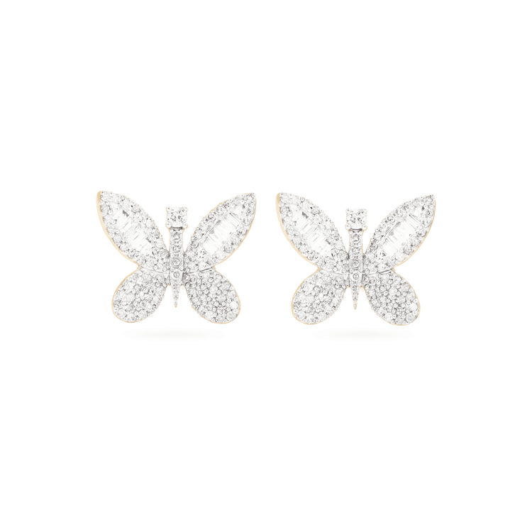 2.0 TCW Round & Baguette Cut Moissanite Butterfly Stud Earrings in Gold
