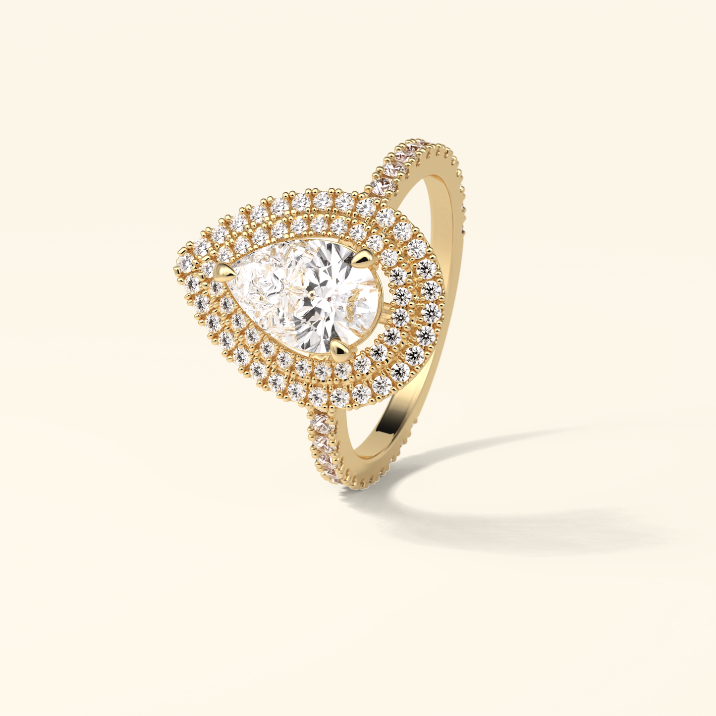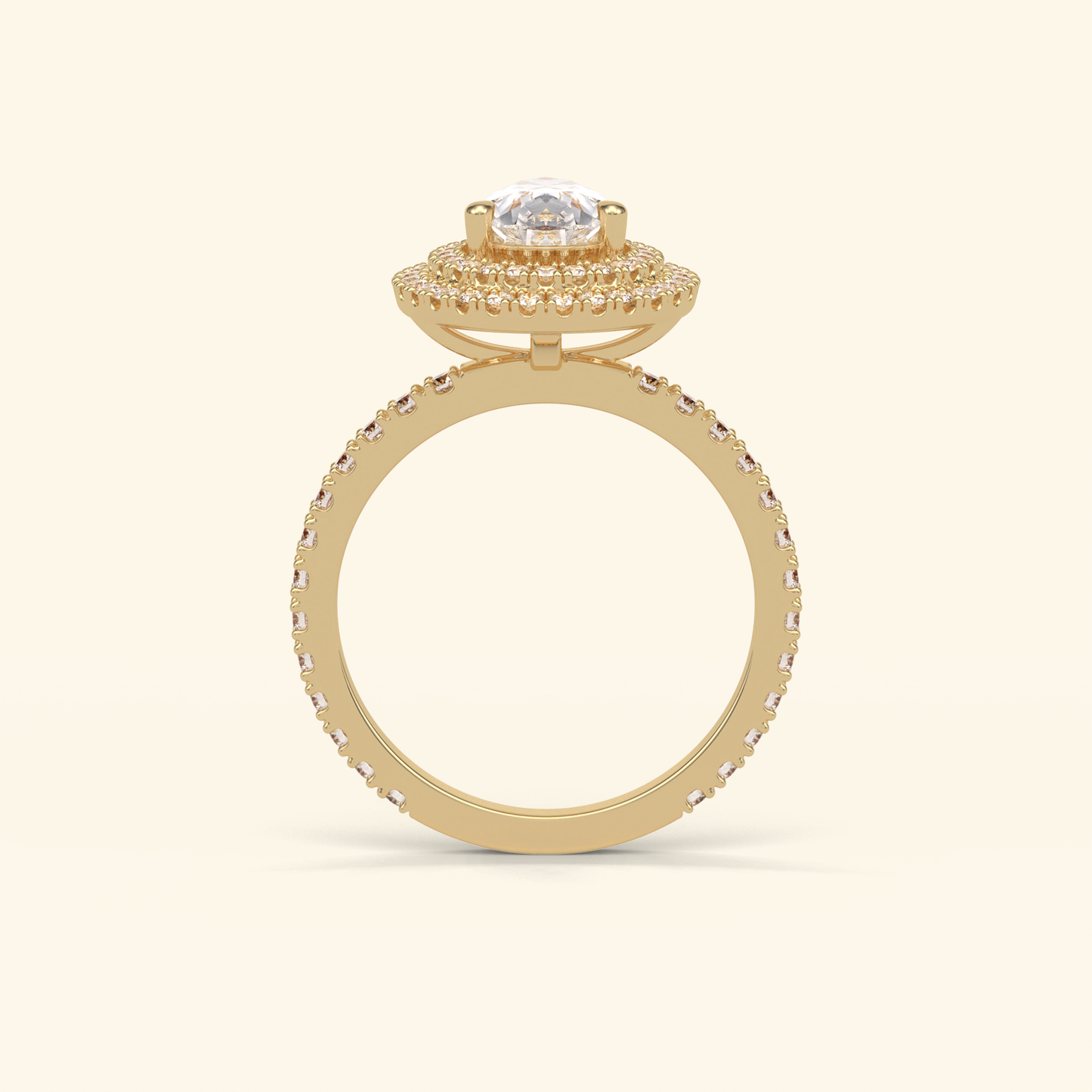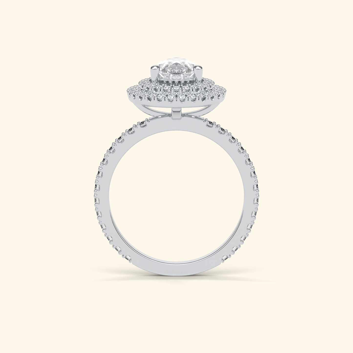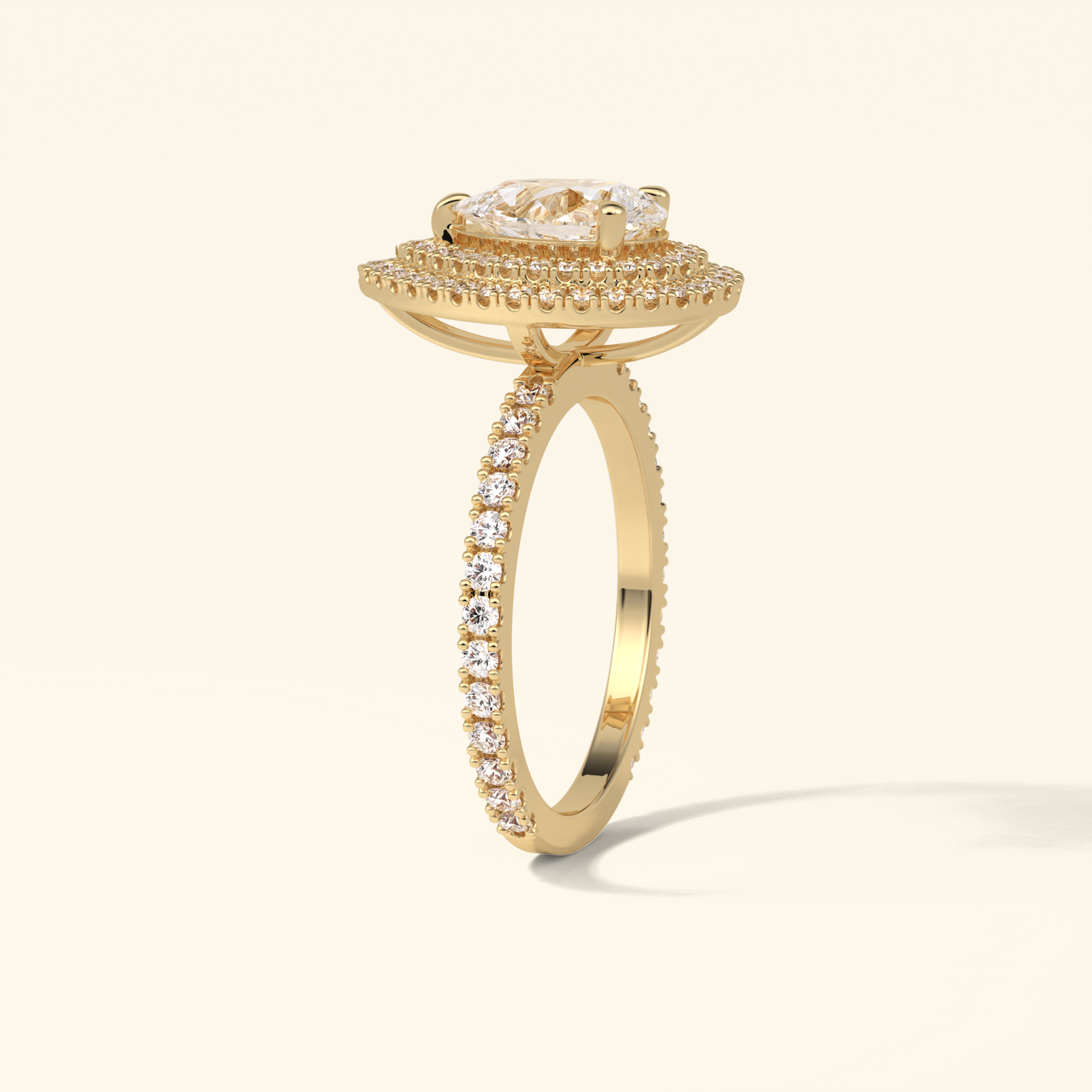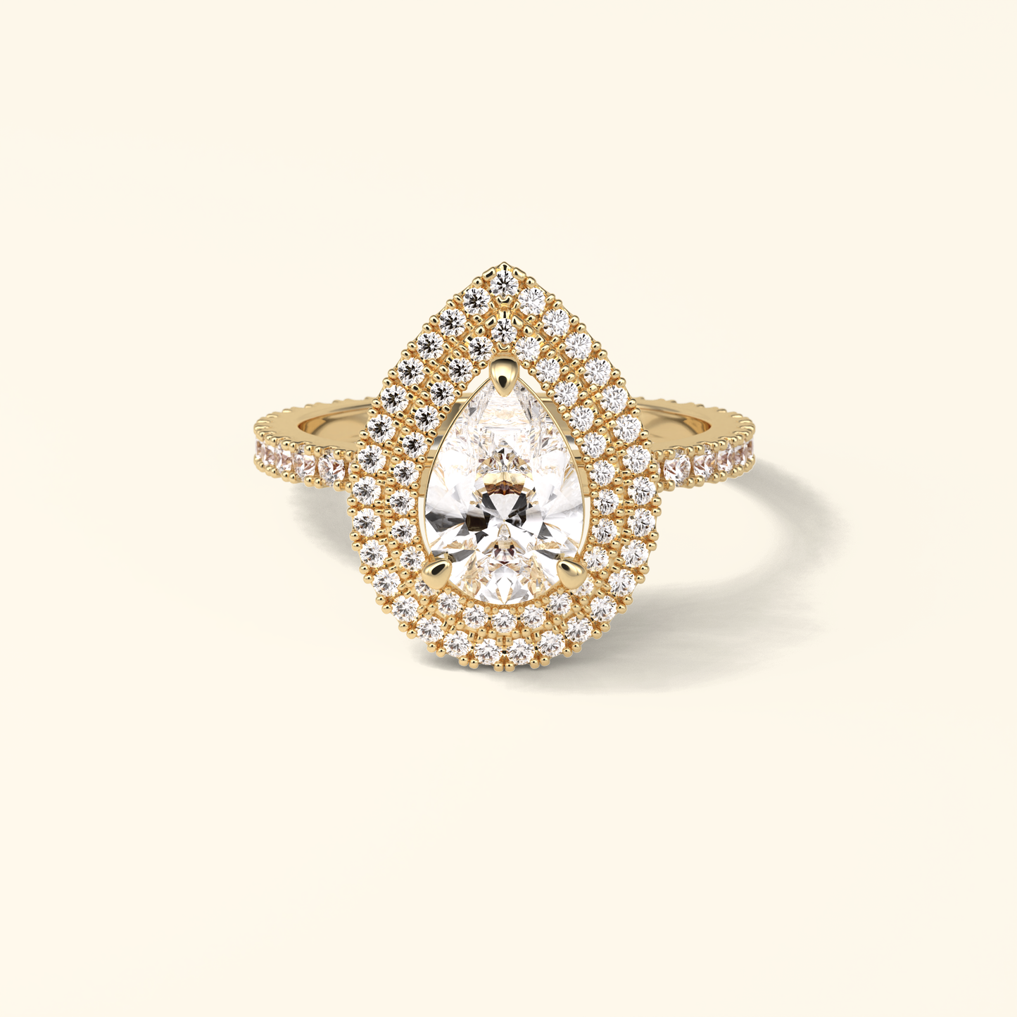 Pear Moissanite Double Halo Engagement Ring – 1.33 CT Center Stone with Pave Band in Solid Gold
