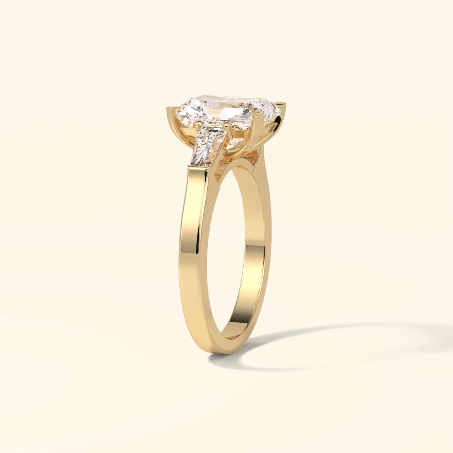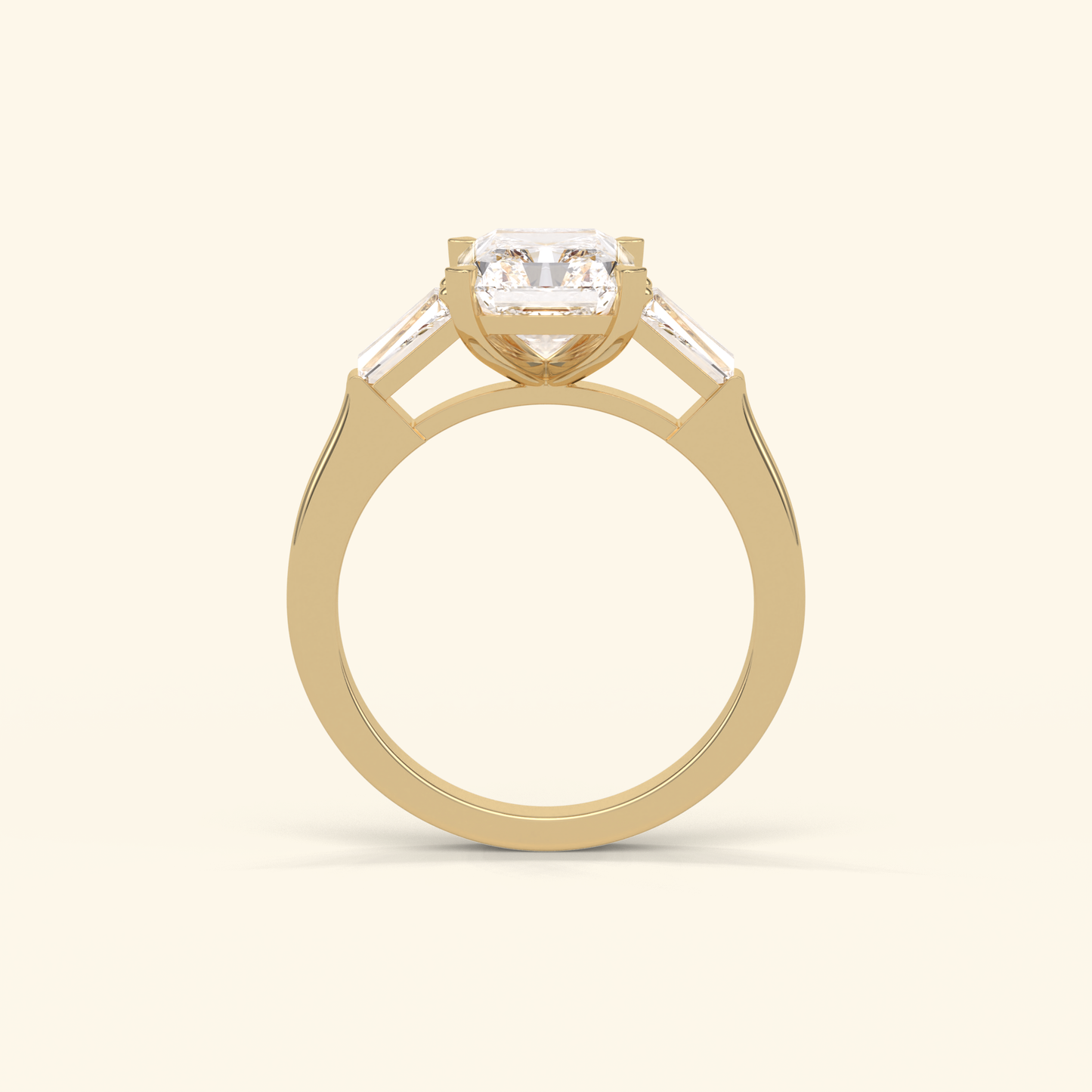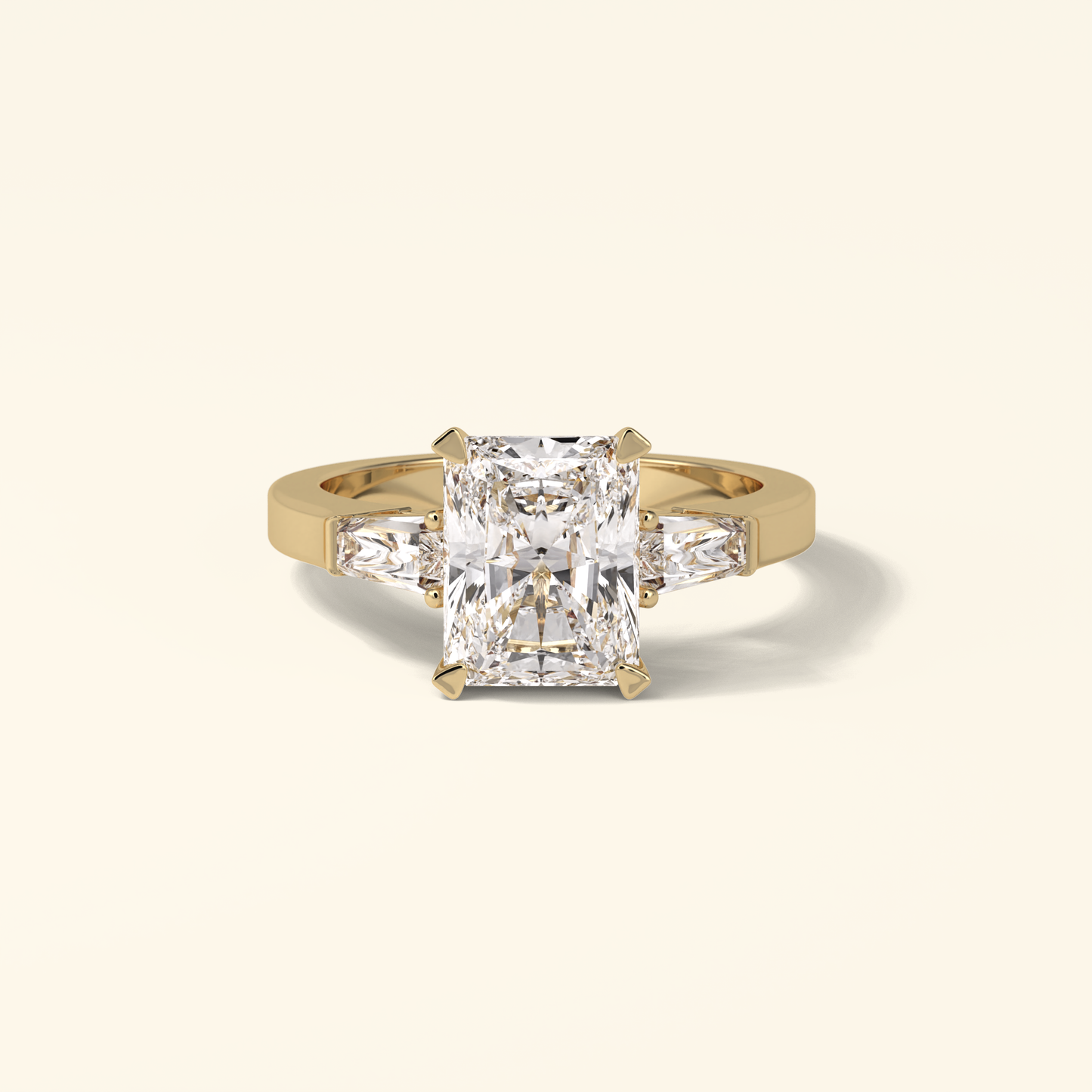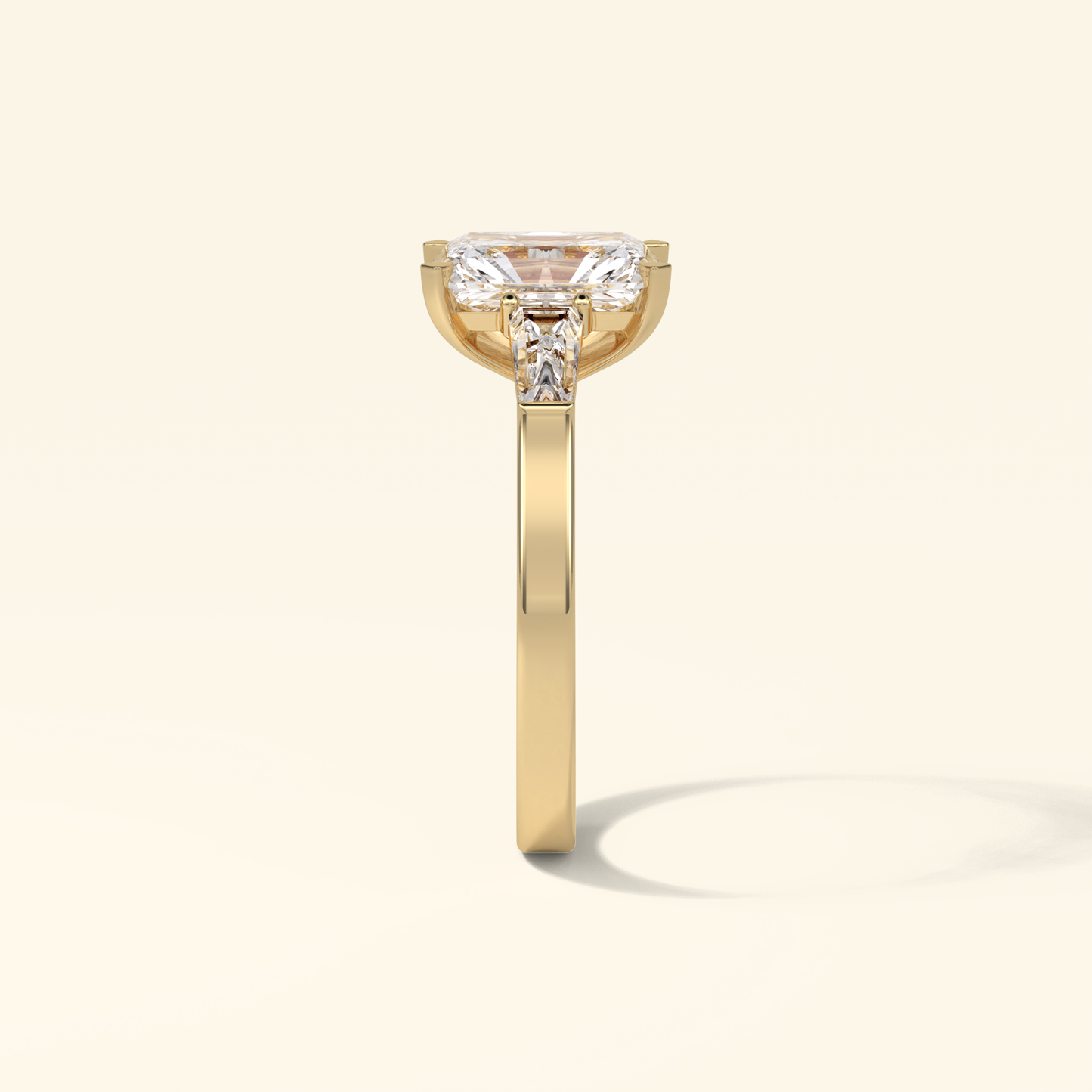 Radiant Moissanite Three Stones Engagement Ring – 2.3 CT Center Stone in Solid Gold
