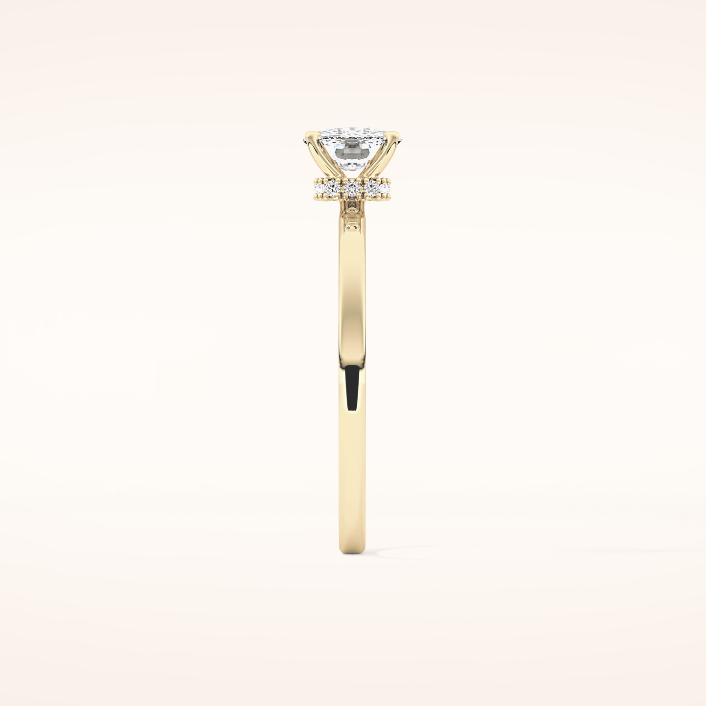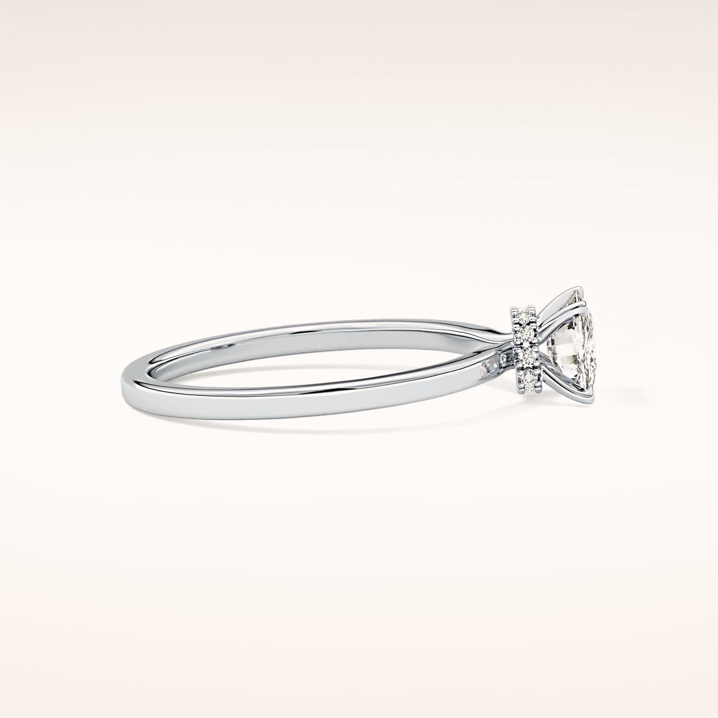 A luminous Cushioin-cut lab grown diamond sits at the center, capturing light with extraordinary fire. It is gracefully balanced by a 0.033 TCW Round side diamond that adds depth, dimension, and a soft, romantic glow. The band is thoughtfully accented with two additional stones, creating a seamless sparkle that dances with every movement. Choose your perfect metal in 14KT or 18KT, available in Yellow, White, or Rose Gold.