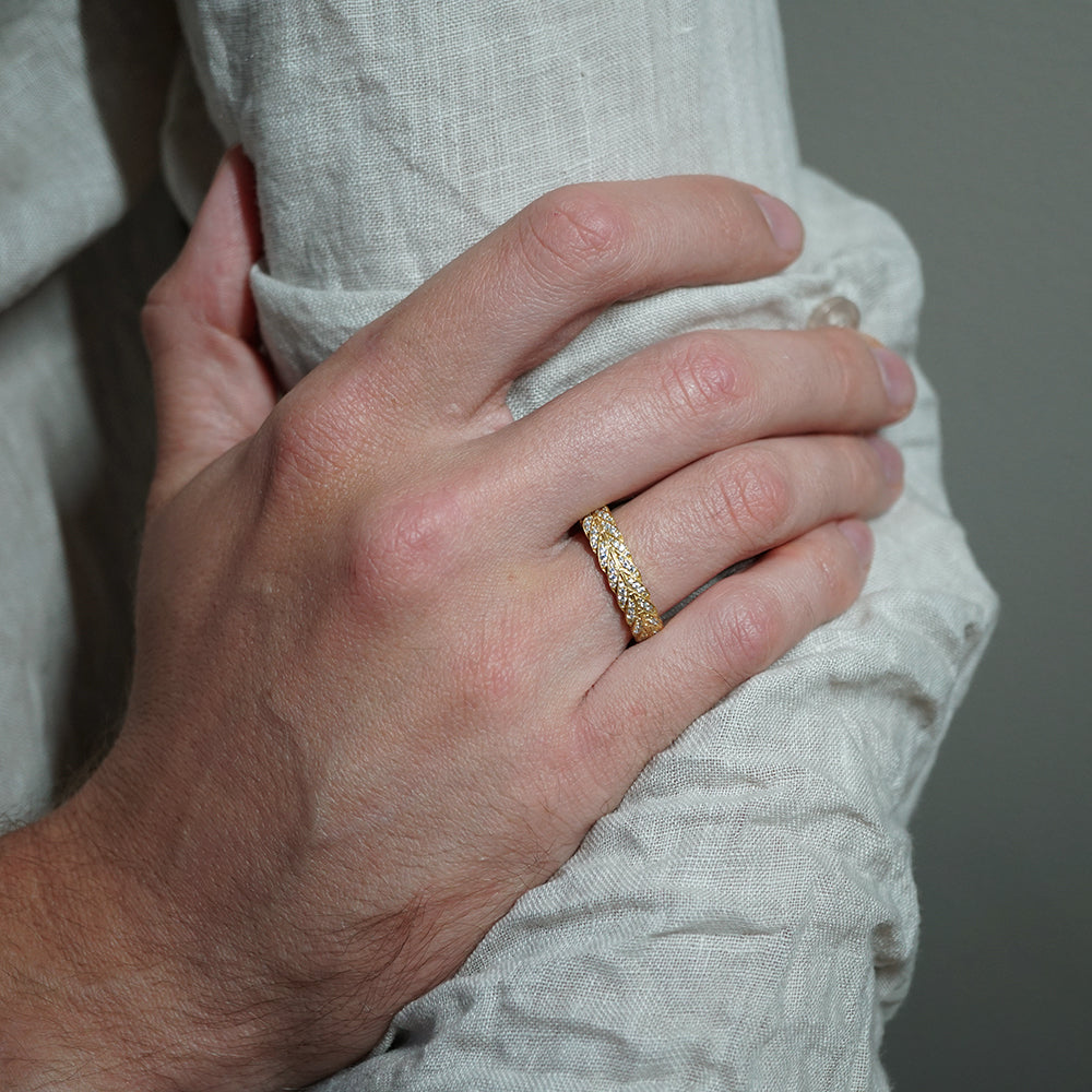 This piece was designed with our signature 1.2mm band. It is specifically designed and crafted to be not only delicate-looking, but also long-lasting. However, we know some people prefer a thicker band, and we can customize our bands to 1.5mm or 2mm for most designs. Please reach out to our customer care team with any questions about customizing the band for this piece!