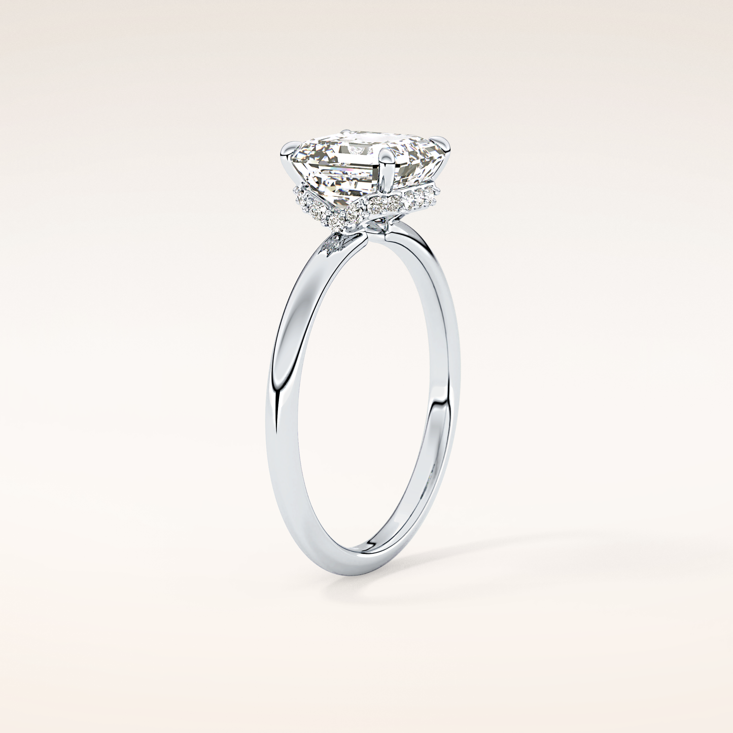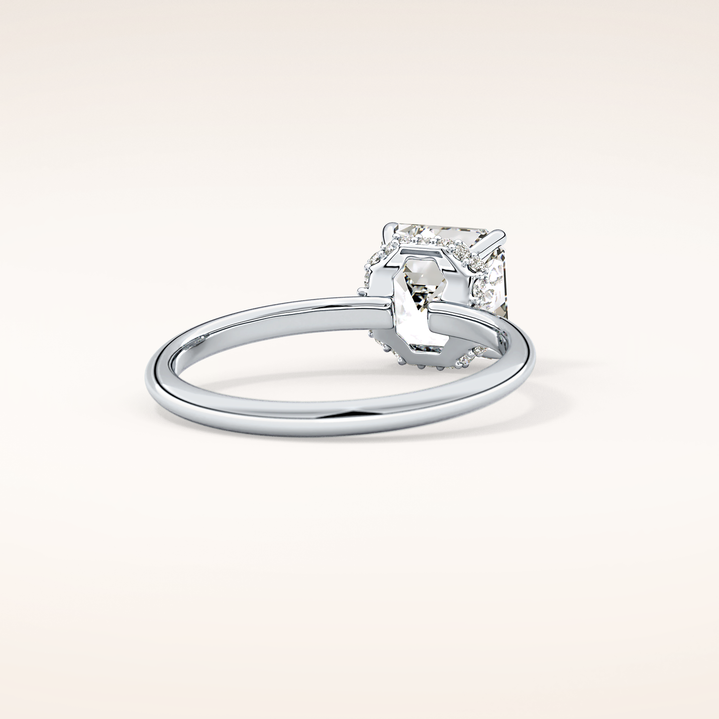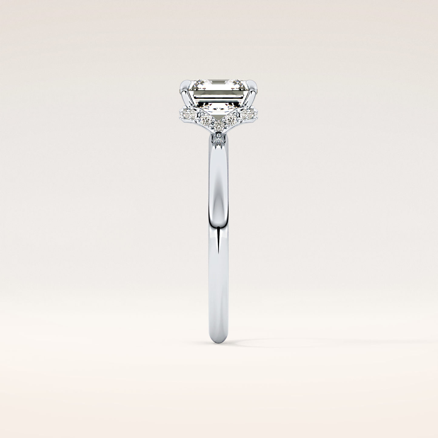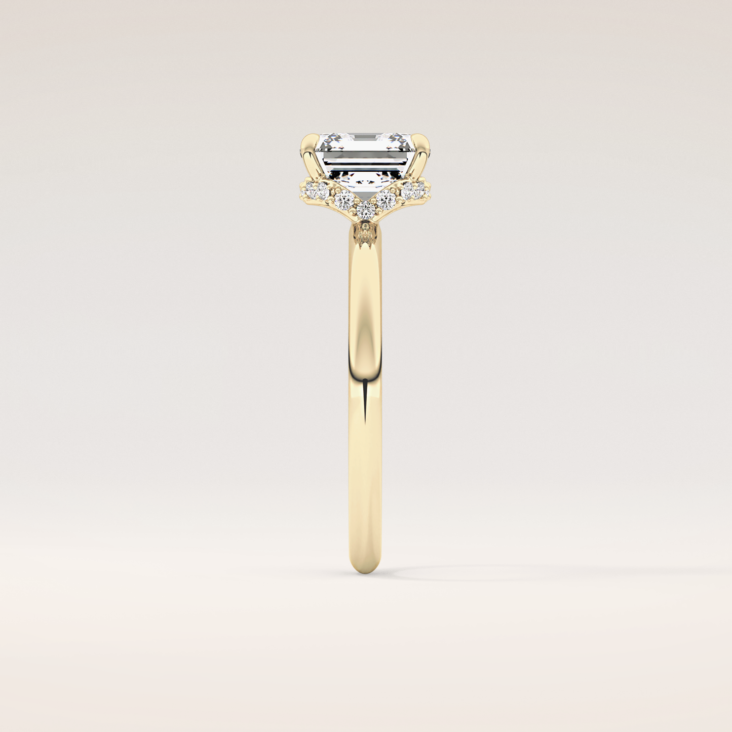 A luminous Asscher-cut lab grown diamond sits at the center, capturing light with extraordinary fire. It is gracefully balanced by a 0.1 TCW Round side diamond that adds depth, dimension, and a soft, romantic glow. The band is thoughtfully accented with two additional stones, creating a seamless sparkle that dances with every movement. Choose your perfect metal in 14KT or 18KT, available in Yellow, White, or Rose Gold.