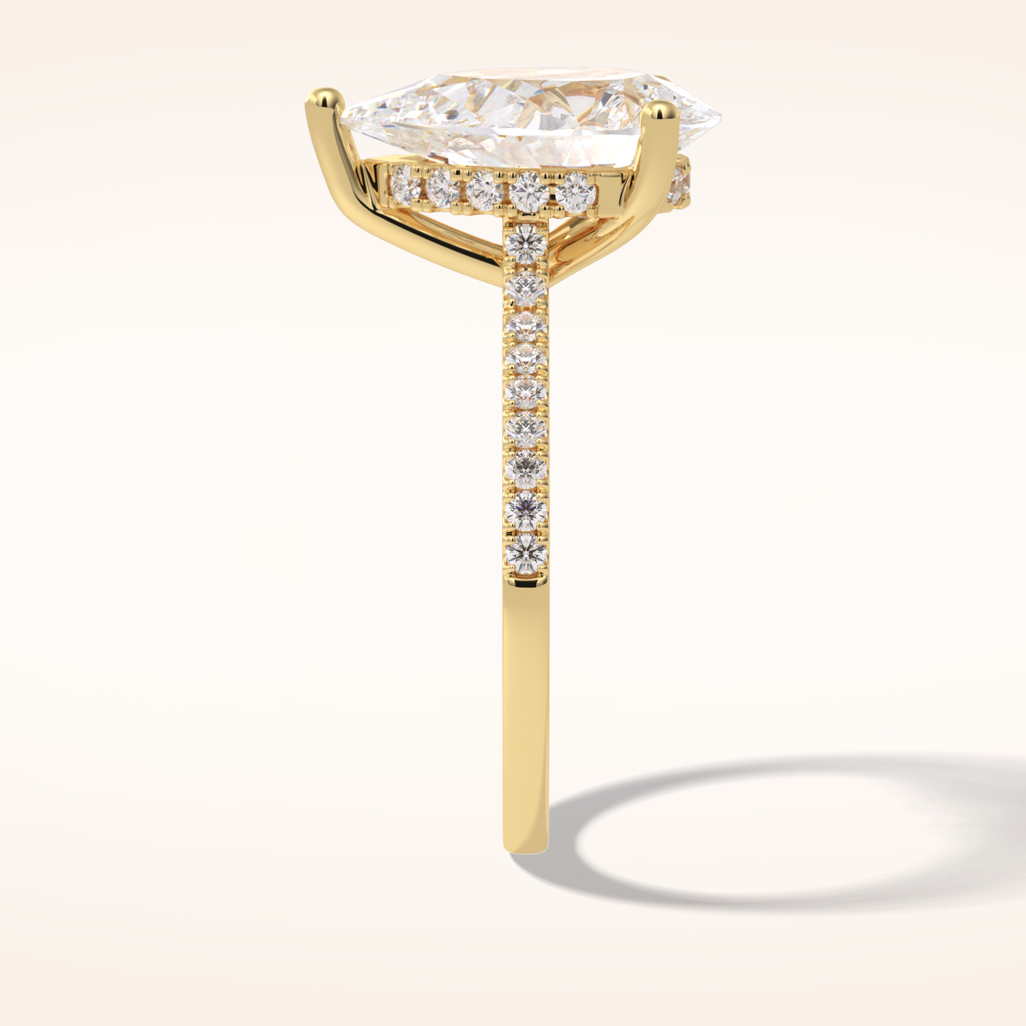 A luminous Pear-cut lab grown diamond sits at the center, capturing light with extraordinary fire. It is gracefully balanced by a 0.35 TCW Round side diamond that adds depth, dimension, and a soft, romantic glow. The band is thoughtfully accented with two additional stones, creating a seamless sparkle that dances with every movement. Choose your perfect metal in 14KT or 18KT, available in Yellow, White, or Rose Gold.