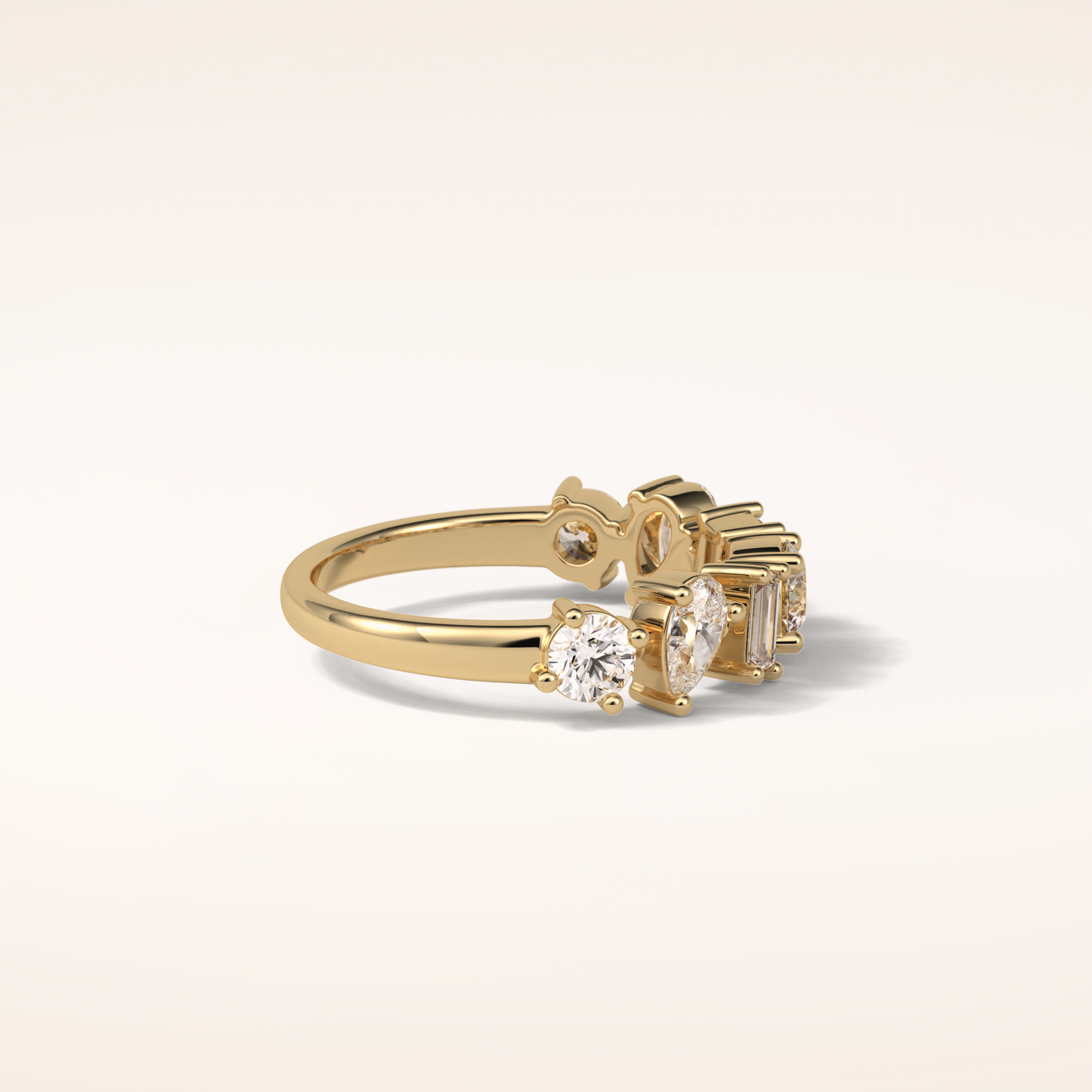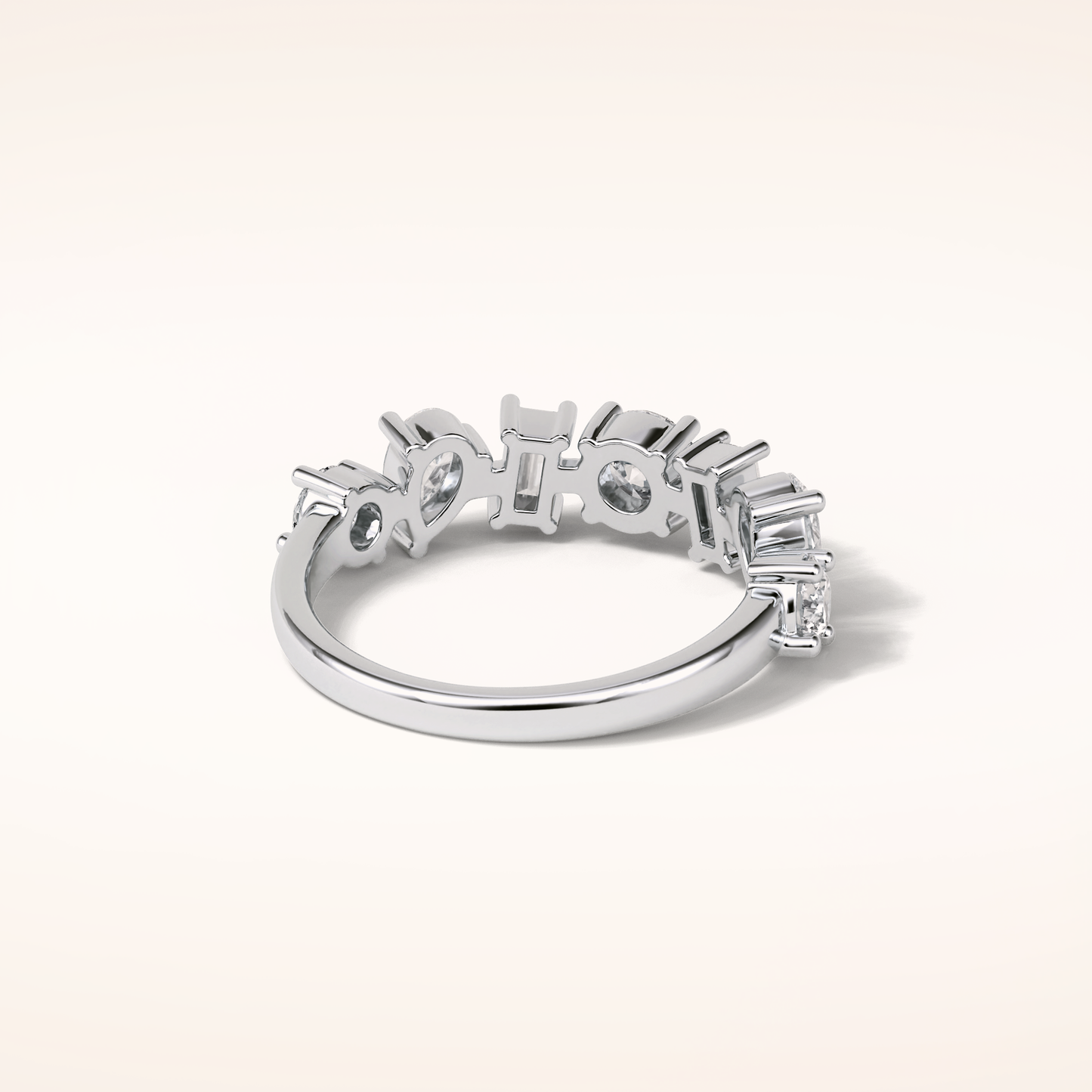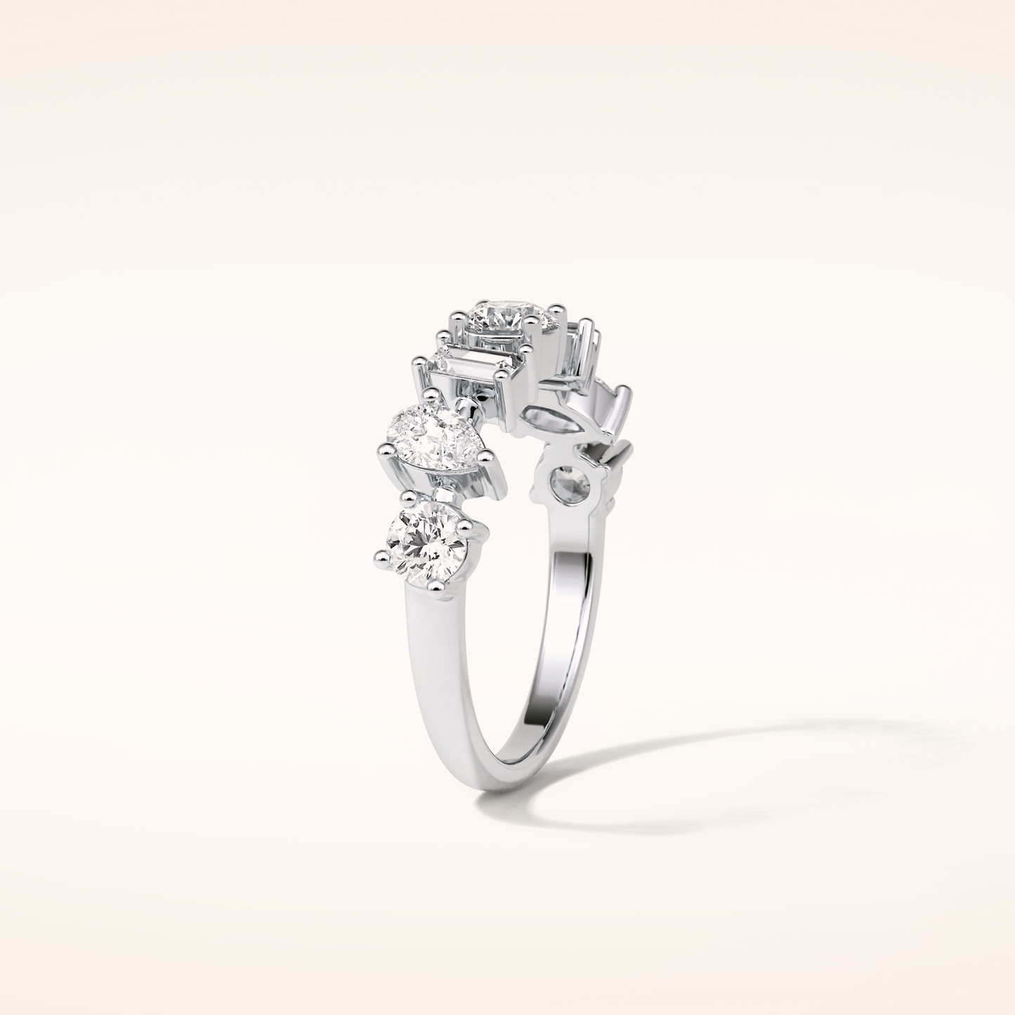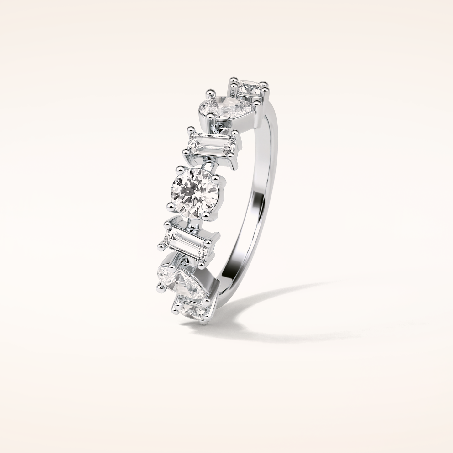 Elegant, modern, and full of meaning—this Half Eternity Moissanite wedding band adds a graceful contour to any engagement ring or makes a statement all on its own. Featuring 1.4 total carats of pear, baguette and round-cut Moissanite, each stone is carefully set to follow the gentle curve of the band, creating a sophisticated sparkle that complements every hand.