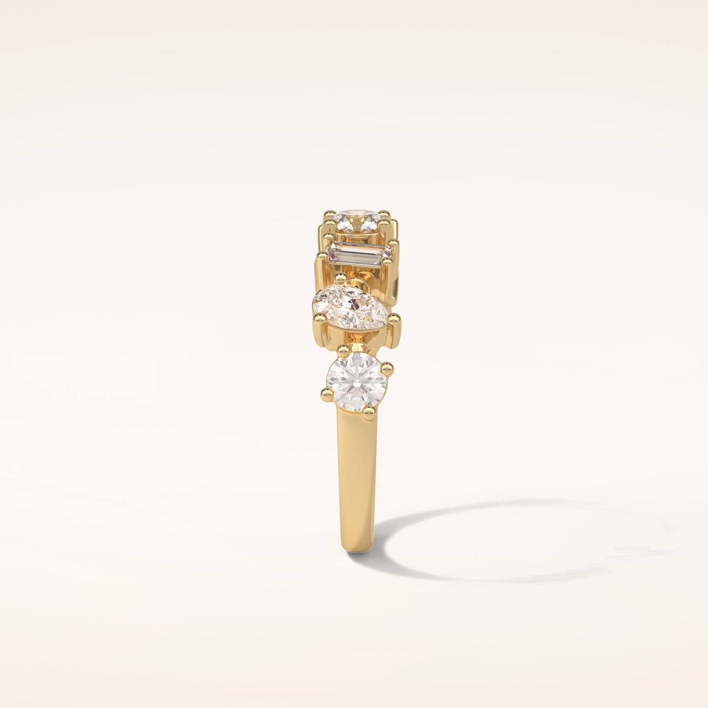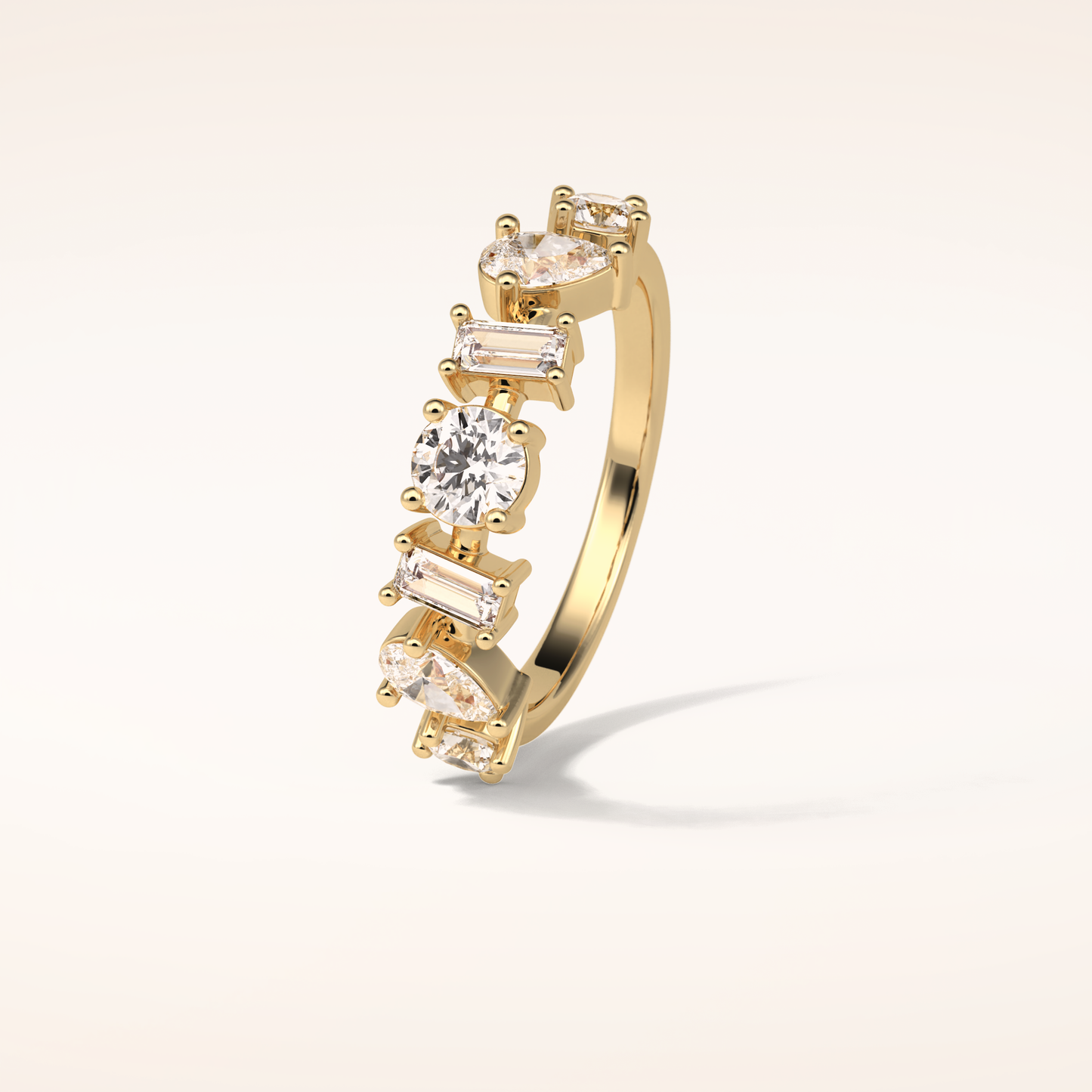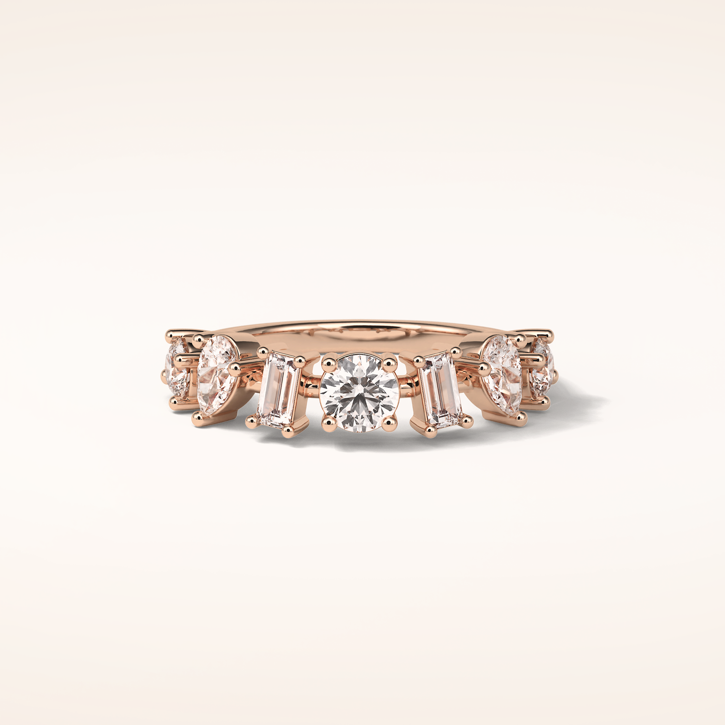 Elegant, modern, and full of meaning—this Half Eternity Moissanite wedding band adds a graceful contour to any engagement ring or makes a statement all on its own. Featuring 1.4 total carats of pear, baguette and round-cut Moissanite, each stone is carefully set to follow the gentle curve of the band, creating a sophisticated sparkle that complements every hand.